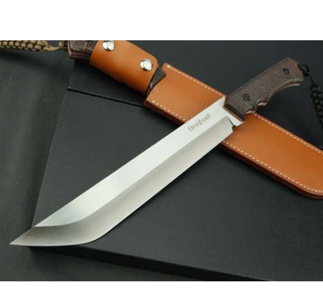 联合刀具—追命直刀 全 长:420mm 刃 长:285mm 柄 长:130mm 刃 宽:47mm 刃 厚:5.5mm 刃 材:5Cr13Mov 重 量:740g(含包装) 硬 度:57HRC 表 面:砂光 柄 材:碳纤 锁 型:定锁 其 他:配皮套和纸盒