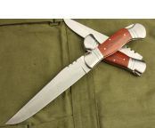 该刀把直刀和折刀的性能融合在一起:打开全长是28.8厘米的折刀,如果将它折叠起来的话,瞬间转变成了一把长度为18.5厘米的直柄刀,相应地它漏出的刀刃也缩小为6.5厘米。手柄背部的刀骨顶端有一颗蛇头,与刻有蛇纹的刀骨连在一起,形成了一条威猛的长蛇。