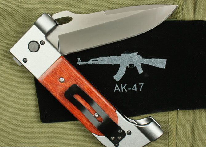 AK-47冲锋英雄 全长:25.7cm 刃长:11.3cm 柄长:14.5cm 刃厚:3.2mm 刃宽: 3.6cm 刃材: 3Cr13 柄材: 红木+双铝头 硬度:53HRC 净重:260克 毛重:270克 表面处理:镀钛 锁型:线锁