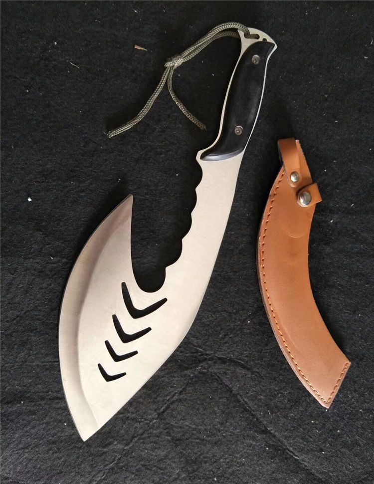 全长:20.5cm 刃宽:11cm 刃厚:2.5cm 刃材:5CR13 硬度:55HRC 表面:砂光 柄材:彩木 柄长:12 净重:600克 毛重:650克 刀鞘:皮套