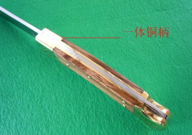全长:22 刃长:9.5 刃材料:进口440C(美产) 刃厚:0.3宽刃口特锋利 硬度:59-60(实测硬度) 手柄:一体黄铜+实木(铜铆钉凸出,有效防滑)
