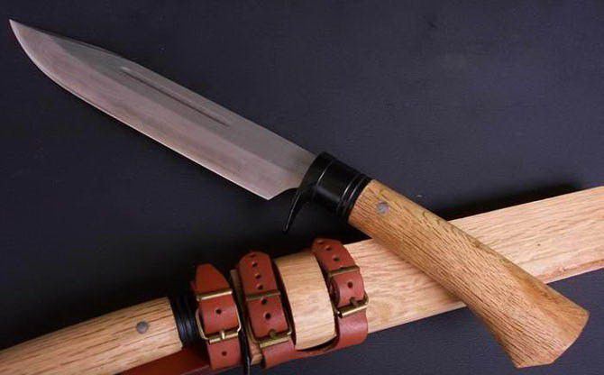 大号关兼常作守护刀(花纹钢) 全 长:38cm 刃 长:22cm 刃 厚:6mm 刃 材:锻打花纹钢 柄 材:坚木 硬 度:58Hrc 表 面:砂光 刀 套:牛皮