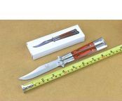 蝴蝶KELE彩木柄甩刀 全 长:22.3cm 刃 长:9.5cm 柄 长:12.3cm 刃 宽:2cm(最宽处) 刃 厚:2.8mm 刃 材:440 硬 度:54HRC 刀 柄:钢头+彩木 表 面:砂光 重 量:133克(含包装) 包 装:白盒
