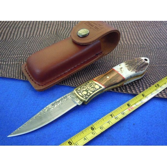 Damascus大马士革花纹钢刀是欧洲人的叫法,就像阿拉伯数字一样,它们的原产地都是印度,大马士革钢刀上的魔性的花纹简直是人工雕琢的自然之美。因动人的传说和自身的优异性能,大马士革钢制成的刀具,成为刀具收藏界的极品。大马士革钢以纹理图案的精致及复杂程度,而定出质量的高低 本款折刀采用日产的大马士革钢,精铸铜压花护钢,刀柄精铆天然鹿角和酸枝实木,压花底骨片,美观细腻,非常适合送礼和收藏