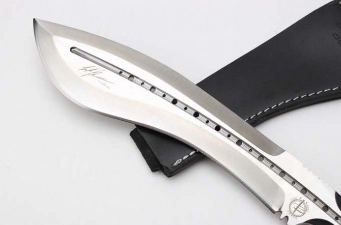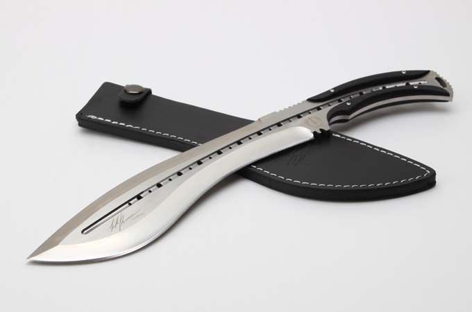 托德.贝格—恶龙狗腿刀(加强版) 全 长 :355mm 刃 长 :23mm 柄 长 :120mm 刃最宽:55mm 刃 厚 :6mm 刃 材 :9cr18mov 重 量 :560g(含包装) 硬 度 :59-60HRC 表 面 :砂光 柄 材 :钢一体柄+G10条 锁 型 :定锁 其 他 :配牛皮套+牛皮纸盒子 备注:该品的钢材由原来的刃 材:8cr18mov升级为刃 材 :9cr18mov,升级了~~