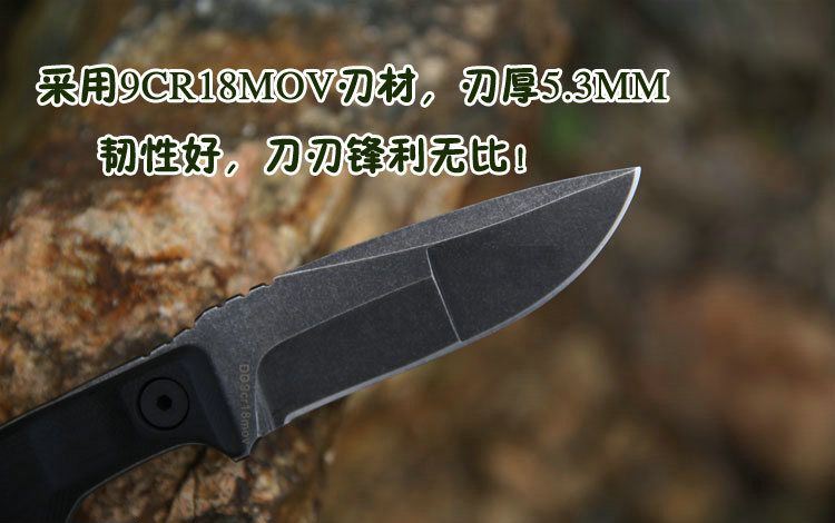 材质:9CR18MOV 手柄:黑绿10MM G10材质 刀鞘:进口2.0厚Kydex 总长:21.7CM 刃长:9.8CM 刃宽:3.1CM 刃厚:5.34MM 净重:0.265KG(不含刀鞘) 硬度:60HRC 表面处理:沧桑石洗效果