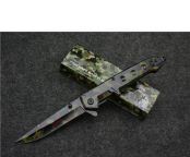 全长:22.0cm 刃长:9.0cm 柄长:12.5cm 刃厚:2.8mm 刃宽: 1.7cm 刃材: 420 柄材: 钢柄 硬度: 55HRC 毛重: 180克 表面: 迷彩 锁型: 侧锁快开 其他: 带坚固背夹、玻璃撞针