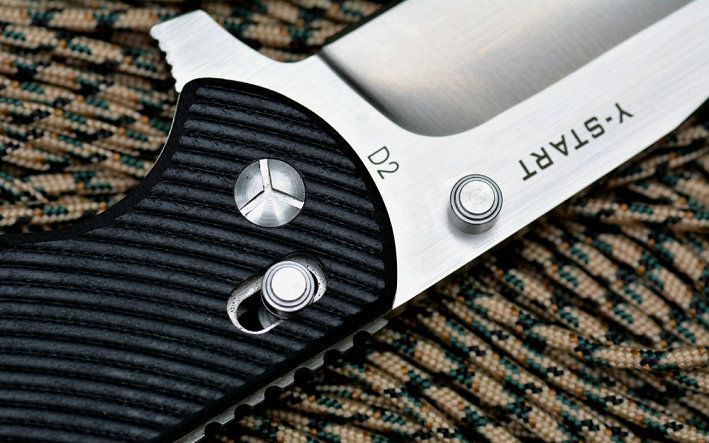 这是华仕达公司2016年首推出的一款单手快开轴锁折刀,为了保证刀刃的高性能,刀刃采用线切割开料,避免了模具开料对钢板的刚性冲击。刀刃采用国内最高标准的锻打钢材D2, 真空热处理,硬度保证在HRC59-60之间。