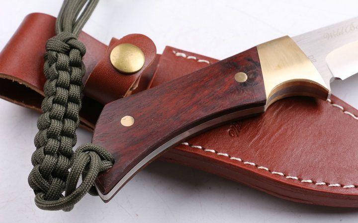 山猪狂奔小直刀 全长:22.0cm 刃长:11.8cm 柄长:11.2cm 刃厚:4.2mm 刃宽:3.0cm 刃材:D2 柄材:龙骨结构+黄檀木 硬度:59HRC 净重:250克 毛重:350克(含包装物) 表面处理:砂光 刀套:真皮套