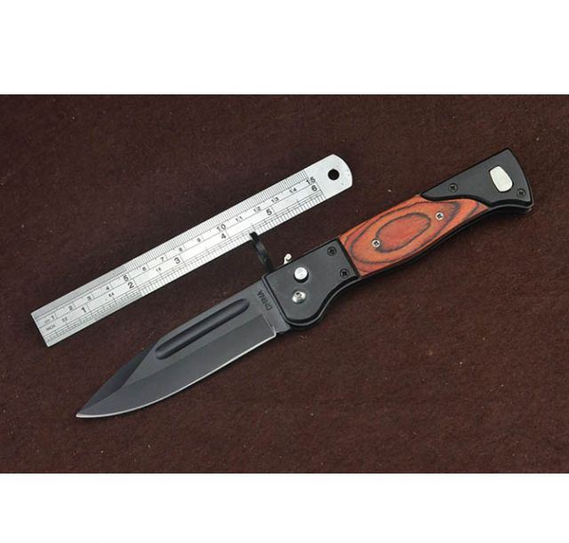 黑版AK-47枪刺弹簧刀(小号) ◇全 长:23.5cm ◇刃 长:9.8cm ◇柄 长:13cm ◇刃 宽:2.8cm(最宽处) ◇刃 厚:3mm ◇刃 材:3cr13 ◇硬 度:55HRC ◇刀 柄:双钢头+彩木片 ◇表 面:黑色 ◇重 量:238克 ◇备 注:带尼龙套