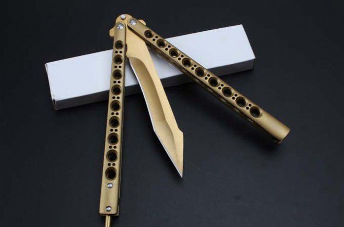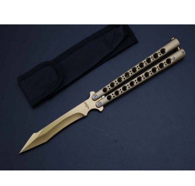 the one九孔猛禽甩刀蝴蝶刀(黄金版) 全长:29CM 刃长:13.5CM 刃厚:0.3CM 刃材料:440C 刃硬度:58 柄材料:不锈钢压铸 柄硬度:40 重量:200克