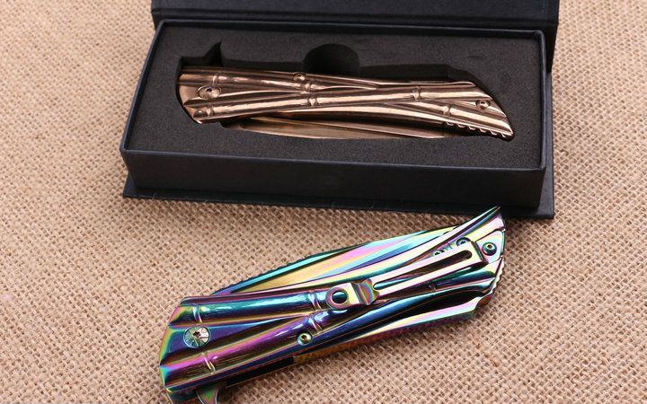 微技术终结者两色折刀 全长;22.2cm 刃长:9.5cm 柄长:12.8cm 刃厚:0.39cm 刃宽:2.8cm 刃材:5CR15MOV 柄材:全钢片 硬度:57HRC 净重:260克(含包装) 锁定:线锁 表面处:钛金色+彩钛两款任选,下单注明 其他:原厂黑盒
