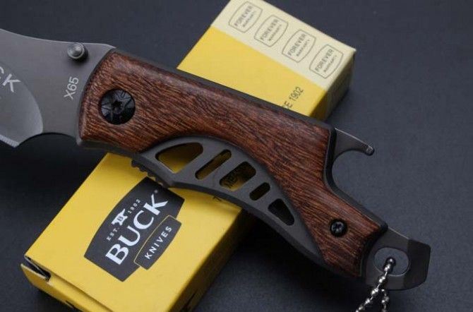 巴克X65小折刀 全 长:140mm 刃 长:53mm 柄 长:88mm 刃 宽:25mm 刃 厚:2.9mm 刃 材:5Cr13 重 量:89g(含包装) 硬 度:57HRC 表 面:镀钛 柄 材:钢+鸡翅木 锁 型:线锁 其 他:配纸盒 功 能:自带开瓶器和一字批,适合户外应急