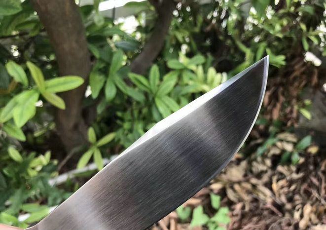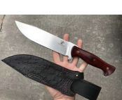 总长:31cm 刃长:18cm 刃厚:6MM 刃宽:4.2cm 钢材:进口DC53钢 硬度:60-61HRC 柄材:进口科檀木(皇帝木),精美纯铜花钉锁定 表面效果:纯收工拉直纹丝 热处理:真空深冷油淬热处理 皮套:意大利进口植鞣皮纯手工雕花缝线镶鸵鸟脚皮,收藏极好 开刃方式:手工二次开刃