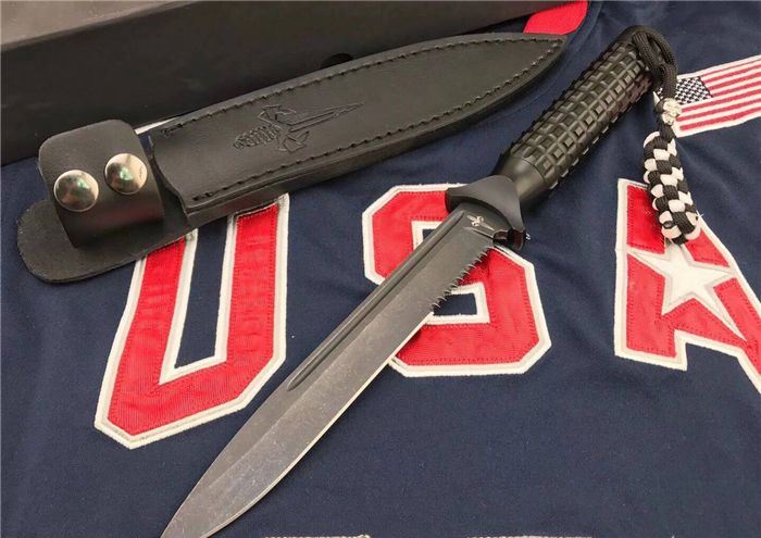 Microtech美国微技术/大剑标双刃黑色半齿 全长:31.5cm 刃长:18cm 刃厚:0.35cm 柄长:13.5cm 刃材:9Cr18M0V 表面:黑钛 硬度:58-60HRC 柄材:铝 鞘材:皮套 总重:500克(含包装) 品质:高品质 产地:国内代工 刃口非常锋利