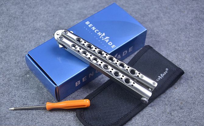 经典蝴蝶甩刀BM46(双锋) 全长:24CM(打开) 刃长:9.5CM 刃厚:0.3CM 刃材料:进口440C 硬度:59-60 重量:190克(含包装) 刀鞘: 刺绣尼龙刀鞘 铸钢柄镂空,压弹出刀 包装:Benchmade高级纸盒