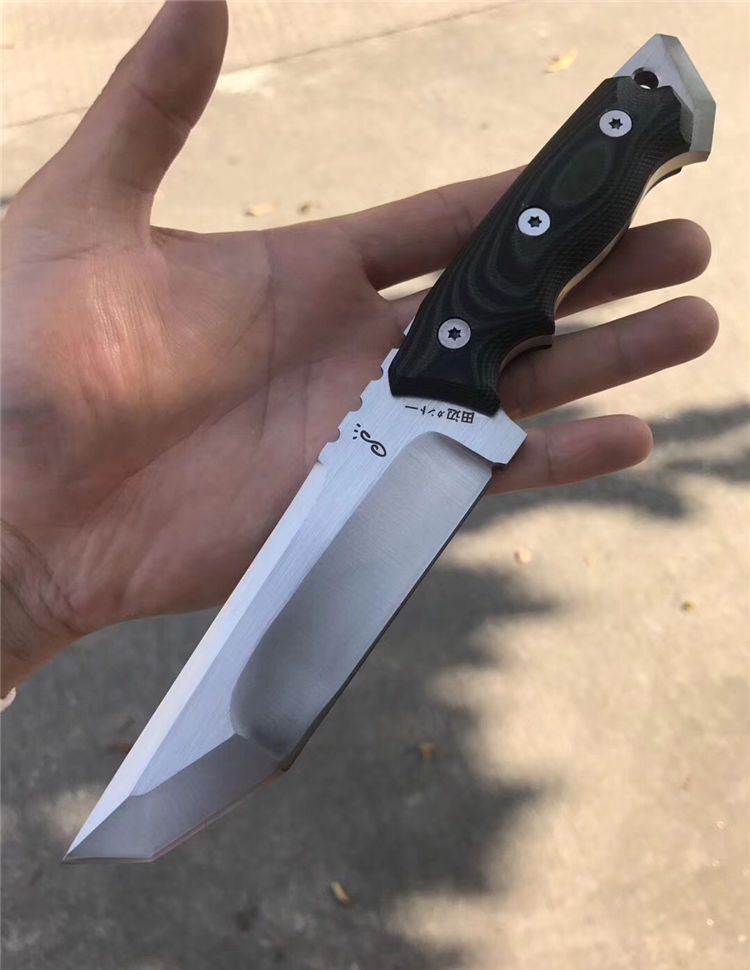 田边一筹直刀 钢材:进口D2钢 总长:24.5左右 刃宽:3.5cm 刃长:12.5cm 刃厚:6MM 表面处理:砂光 硬度:60-61HRC,真空深冷热处理 柄材:黑绿G10 开刃方式:水冷二次开刃