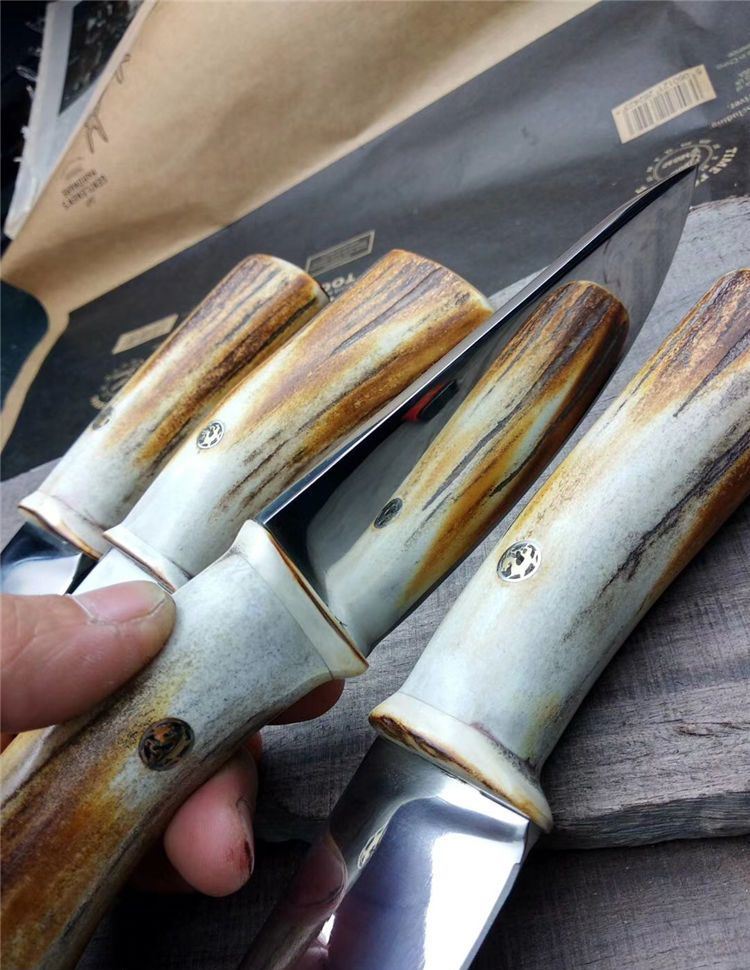 野人风系列--“逐鹿"出货,刃材采用瑞典进口的RLW34钢,果然名不虚传,不愧是世界上最好的钢材之一。柄为天然鹿角。配头层牛皮刀鞘。纯手工制作,刀刃精细打磨镜面抛光,刀柄粗犷防滑舒适,锋利、耐用。