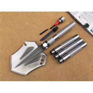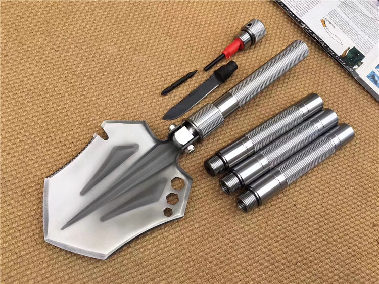 功能:有铲,锄 ,锯,刀,口哨,打火棒,撞击器,十字一字螺批等功能,在生产工艺上采用上好淬火高碳钢,增加强度,抗磨损,抗腐蚀,耐高温等优势.有把铲在手,登山,外出永不怕