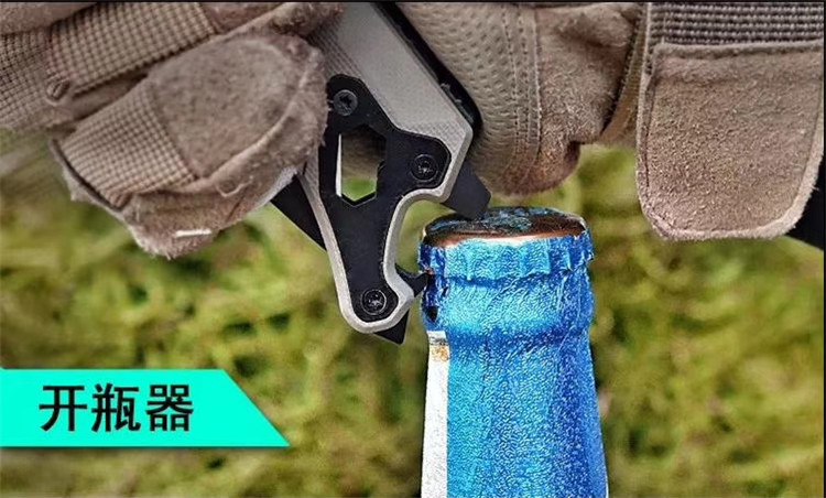 刀刃用材9Cr14Mov,手柄用材G10复合纤维;刀刃分平刃和半齿半刃;手柄背部内置打火棒、哨子,柄尾设置六角螺母,尾锥,一字改锥、开瓶器;可折叠设计,收纳小巧便携