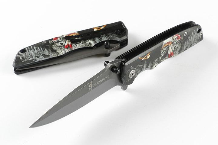 勃朗宁DA80-1快开折刀 全长:22..5cm 刃长:10cm 刃宽:2.8cm 刃厚:0.38cm 柄长:12.5cm 刃材:440 硬度:57HRC 柄材:全钢+表面三D打印图案 锁型:线锁 刀净重:235克 总重量:265克(含纸盒) 其它:原厂彩盒包装