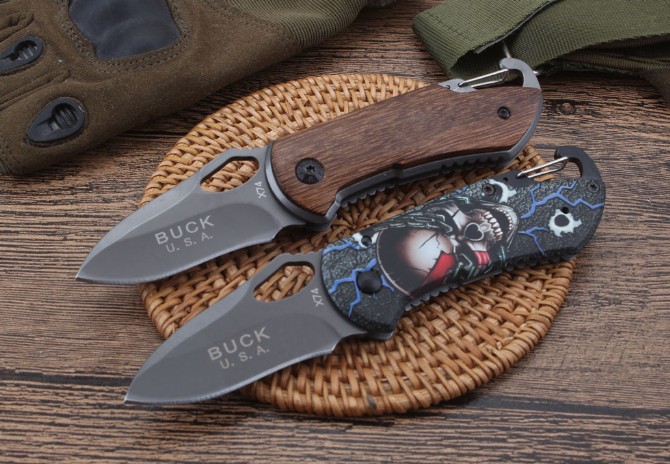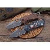 BUCK巴克精品X74折刀 品牌:BUCK 全长:15.0cm 刃长;6.0cm 柄长:9.0cm 刃宽:3.0cm 刃厚:2.9mm 刃材:440C 重量:木柄110g,三D100克(含包装物) 硬度:57HRC 表面:全灰钛处理 柄材:木柄和三D打印图案 锁型:线锁 其他:配彩盒,配刀背夹
