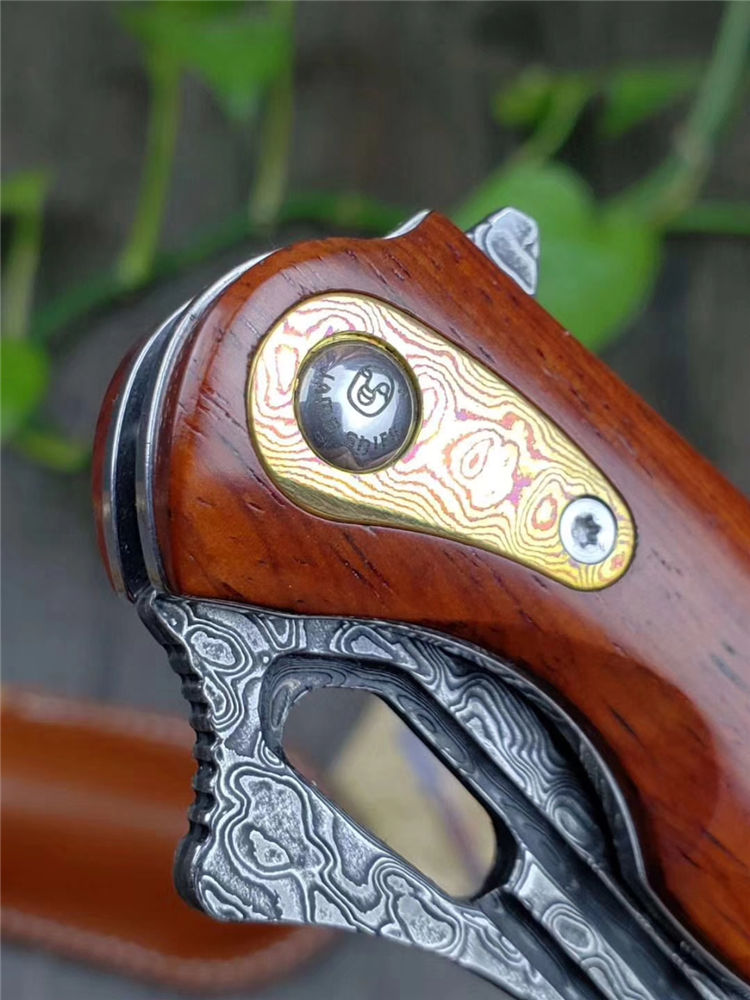 翼龙长有翅膀能飞的爬行动物,俗称飞龙。其头上长有头冠,眼大,嘴尖而长,头部酷似一把锋利的尖刀。 简师傅已翼龙为原型,原创设计了此款大马士革手工折刀,堪称神形兼备,此刀选用VG10刃钢大马士革锻打祥云纹,精挑老料大叶紫檀木刀柄,一体快开设计配置两片高精度滚珠轴承,纯手工背部镂花,大叶紫檀刀柄镶嵌稀有的【木纹金大马士革】堪称点睛之笔。随刀赠送简师傅收藏证书,配置意大利植鞣皮手工定制皮套,可穿皮带,复古礼盒