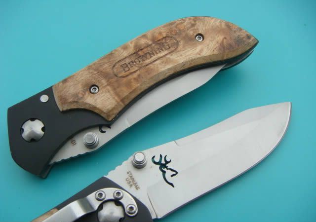 美国勃朗宁SPG风神影木折刀 全长: 20.5CM 刃长: 8CM 刃厚: 0.3CM 刃材: 440C 硬度: 58HRC 柄材: 天然影木 净重: 125g 表面处理:灰钛