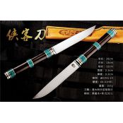 德国侠客直刀 全长:248mm 刃长:122mm 柄长:126mm 刃宽:20mm 刃厚:3mm 刃材:VG-10 重量:200g 硬度:60-612HRC{真空热处理) 表面:镜光 柄材:青松石+黑檀木+黄铜+G10固定环 刀鞘:意大利头层植鞣皮 备注:该刀手柄采用纯天然松石经过数天精细打磨,结合黑檀木合并纯手工制作而成