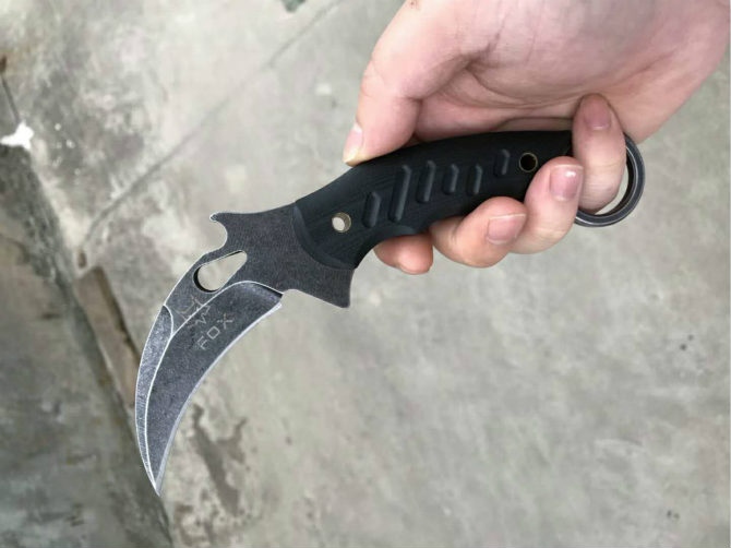 狐狸690爪刀 全长:190mm 刃长:70mm 刃厚:5mm 尾巴孔直径:26 材料厚度:5.2 材料:Aus8 手柄:黑色cncG10 配:皮套