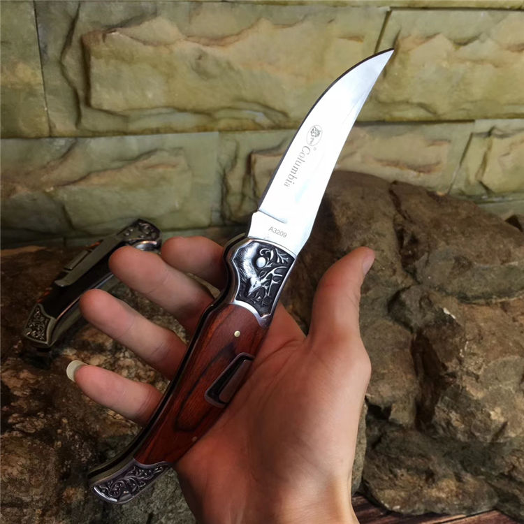 哥伦比亚A3209折刀 全长:23cm 刃长:10cm 柄长:13cm 刃宽:2.8cm 刃厚:2.2mm 刃材:3Cr13Mov 重量:200g(含包装) 硬度:56HRC 表面:拉丝 柄材:全钢镭射刻花+彩木 锁型:安全锁 包装:纸盒 备注:带腰夹、带挂链吊牌