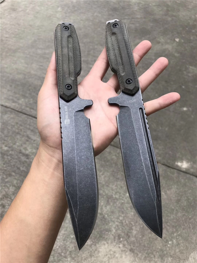 百炼升级版机械战警直刀 总长:28cm 刃长:15.5cm 刃厚:5mm 刃宽:3.6cm 钢材:进口DC53钢 硬度:61-63HRC真空深冷热处理 柄材:亚麻材质、吸汗、速干、防滑 刀套:进口战术K鞘 百炼成刃正品《机械战警升级版》DC53模具钢限量特惠亚麻手柄,升级带槽款,更加霸气,真材实料进口DC53钢,硬度达到62-63HRC