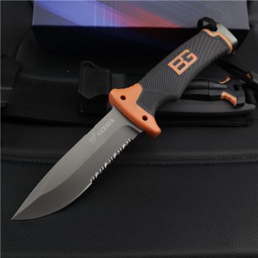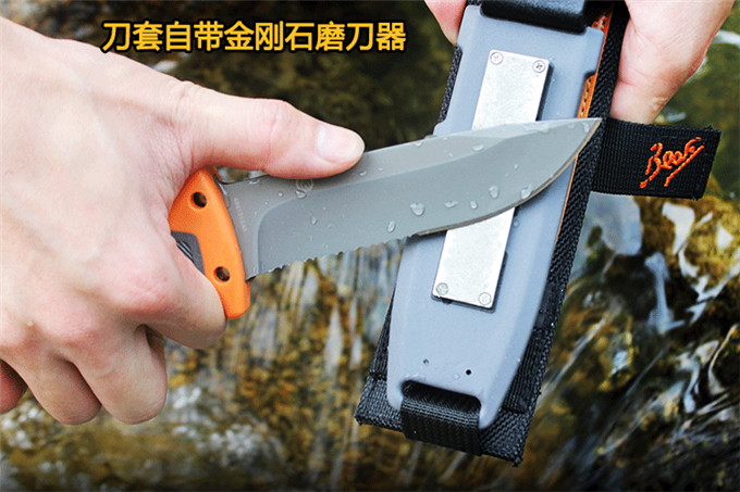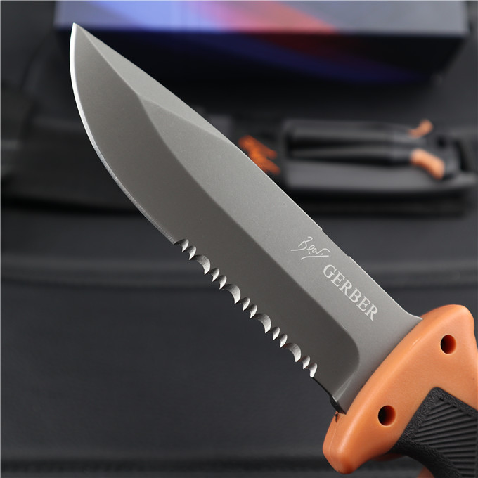 外贸版Gerber戈博贝尔荒野求生直刀 总长:27cm 刃长:12厘米 刃厚:0.5厘米 刀重:240g 毛重:450g 刃材:AUS-8A 硬度:59HRC 表面:钛离子 柄材:尼龙+工程塑料 刀鞘:ABS鞘 代工正品配件齐全:打火石金刚磨刀石刀绳救生口哨尼龙绑腿